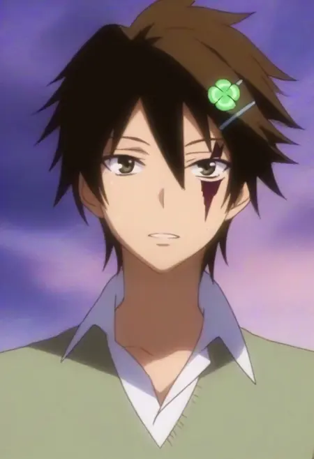 Utsutsu Hasegawa, brown hair, four-leaf clover hair clip, brown eyes, face mark, sweater, v-neck, white collared shirt, rolled sleeves, dark blue pants