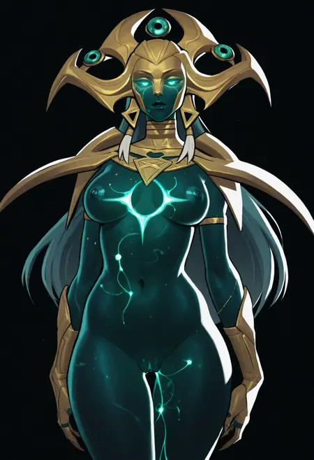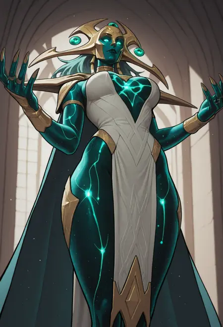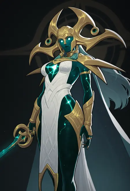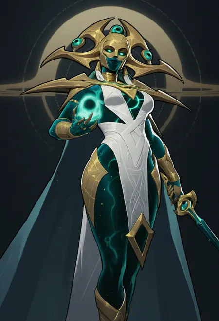 トリガーワード: helac0smos, 1girl, 超然とした体、色付きの肌、白いドレス、骨盤カーテン、マント、剣を握る、輝く目