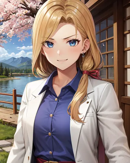 <lora:Erika-06:0.9>, Erika Russell, 金髪, 長髪, 肩越しの髪, 髪に赤いリボン, 中くらいの胸,