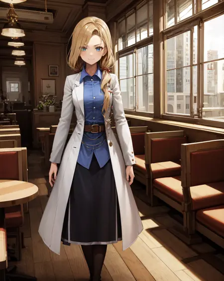 白いラボコート、青いシャツ、長い黒スカート、パンティーホース、赤いハイヒール,