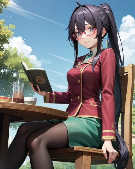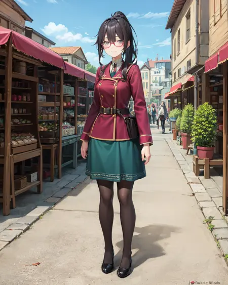 <lora:Dorothee-07:0.7>, Dorothee, black hair, ponytail, long hair, grey eyes, red glasses, messy hair, ahoge, (tired, bags under eyes:1.1),