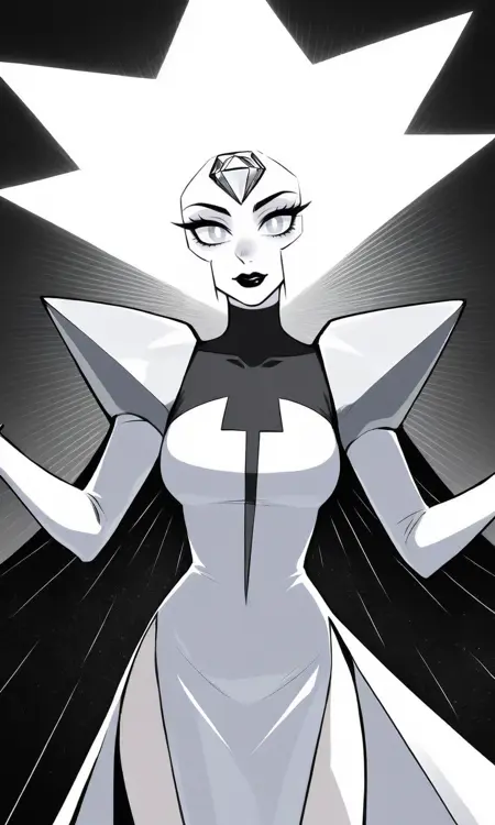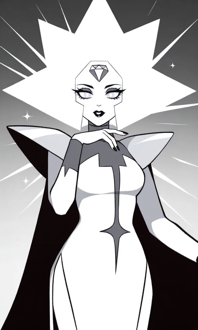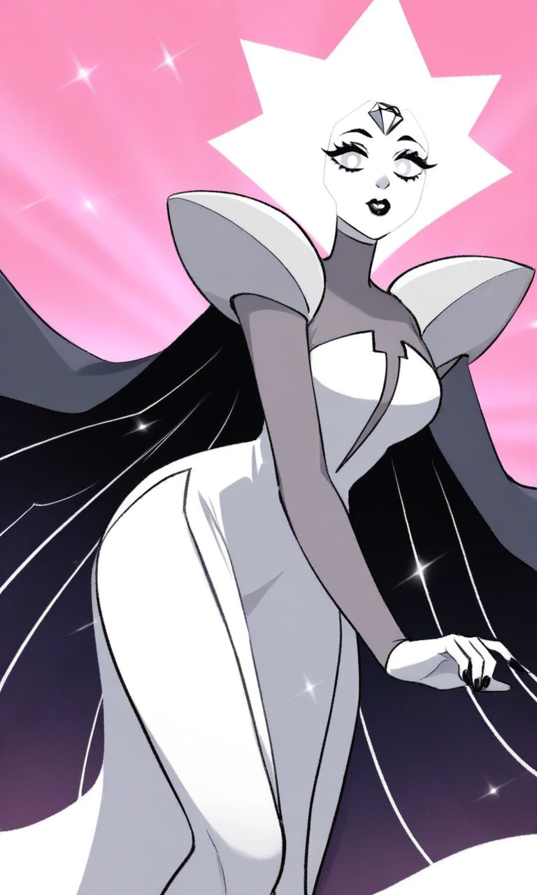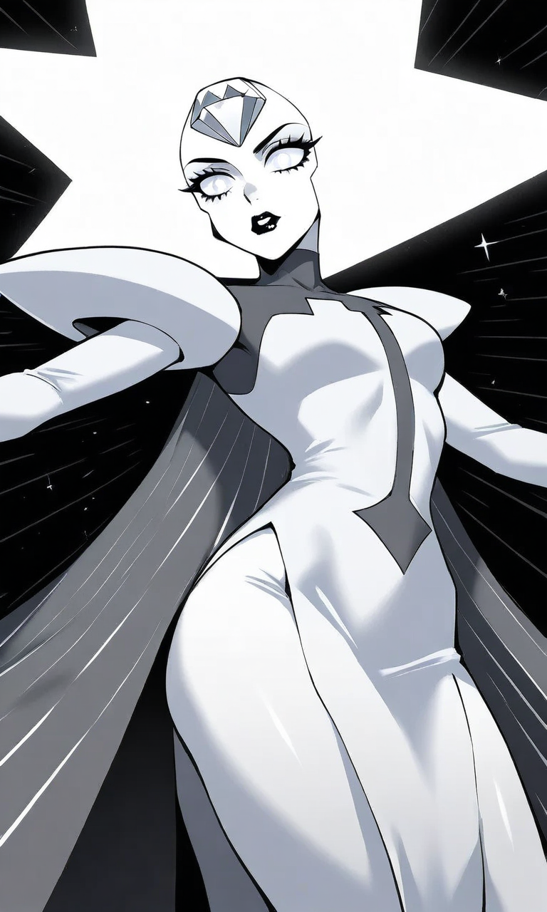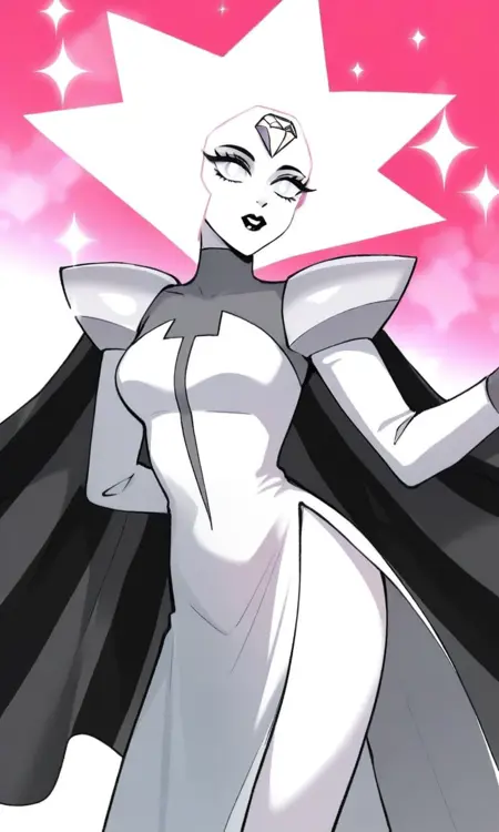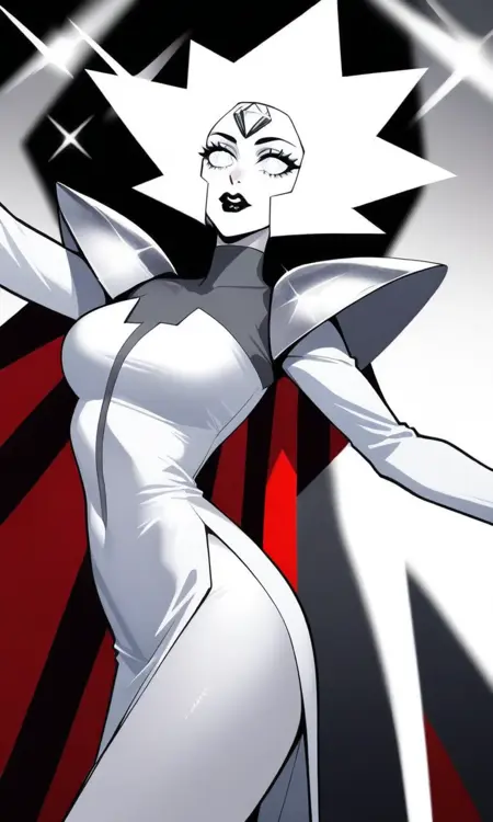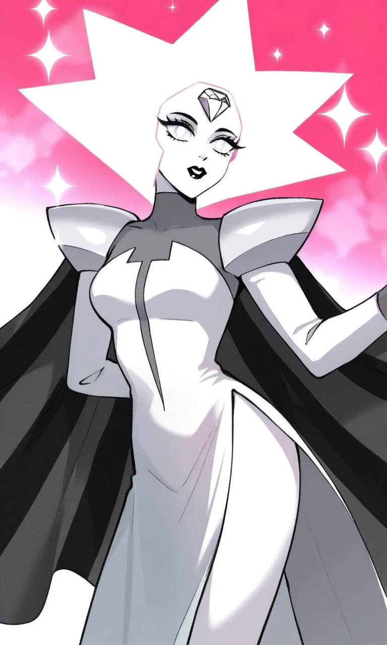 | Trained Words | 1girl,white theme,white skin, spiked hair, short hair, forehead jewel, white gemstone, white diamond,white hair, white eyes,black lips, white pupils, turtleneck dress, long sleeves, shoulder pads, striped cape, black cape, grey cape,sparkle, pelvic curtain, side slit,long dress, see-through Copied! |