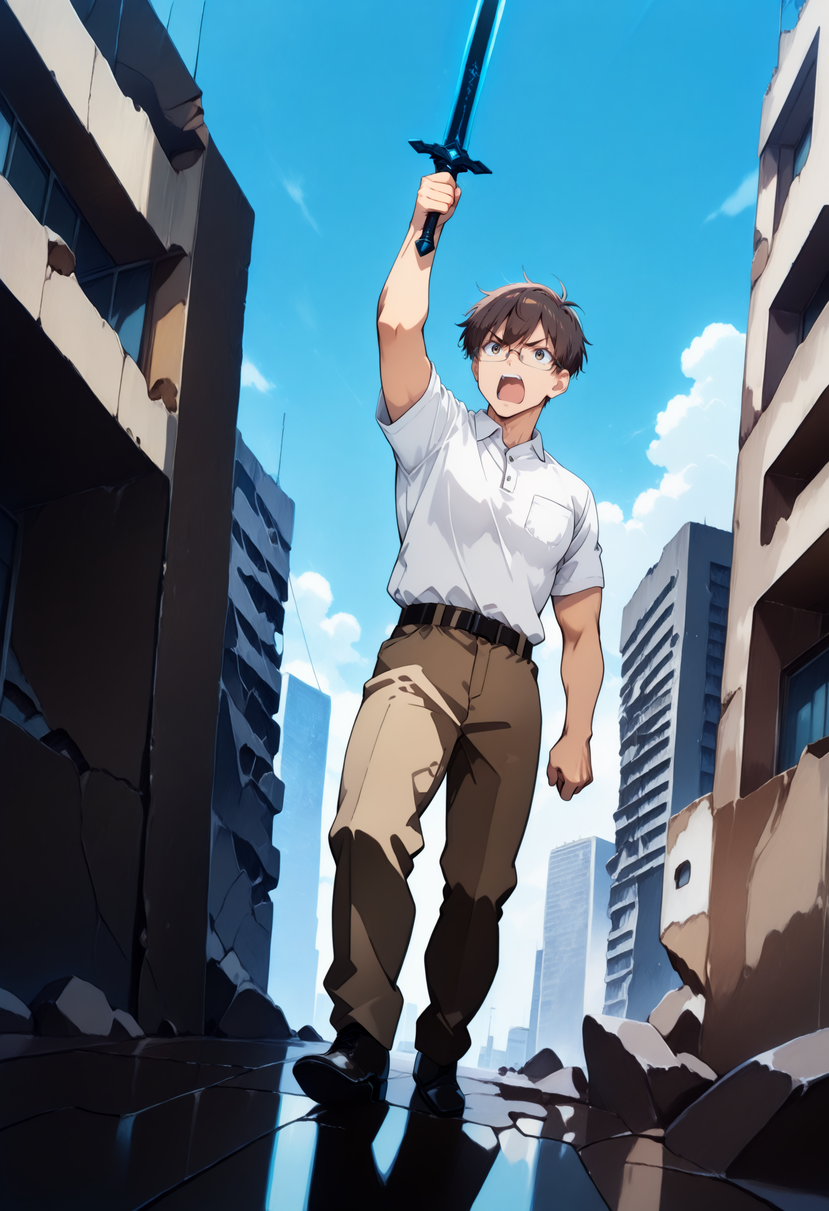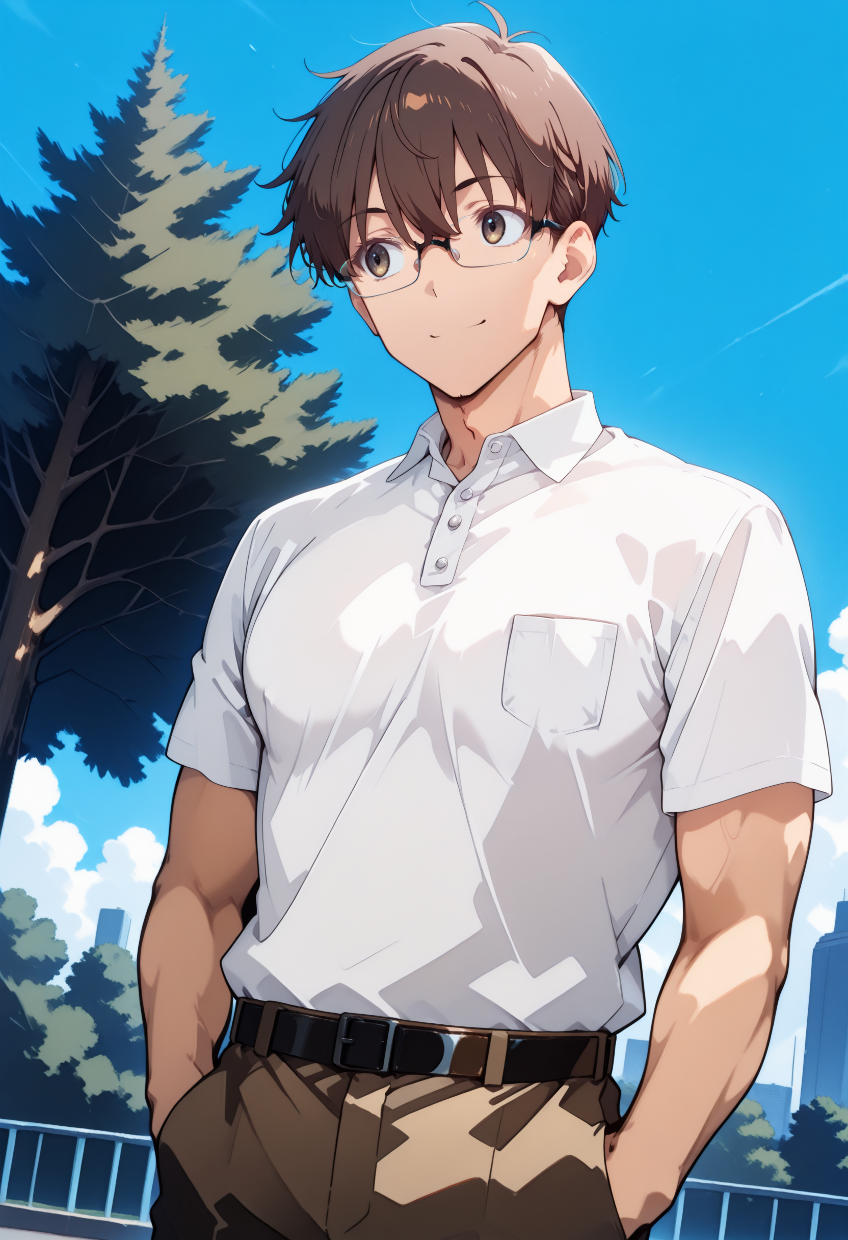 brown pants, black belt, polo shirt, white shirt, breast pocket, glasses, shirt tucked in