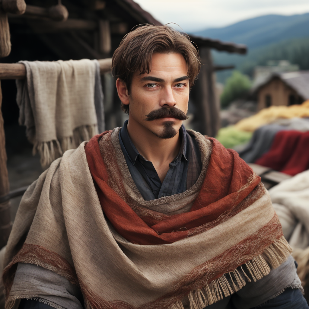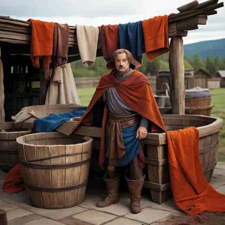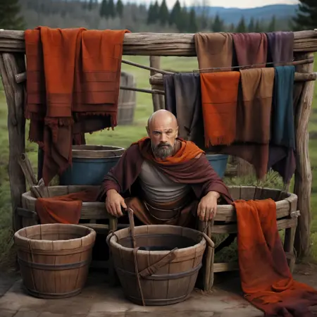 1boy, 1girl, apron, bald, barrel, beard, belt, black hair, blanket, blonde hair, blue eyes, blurry, blurry background, boots, bowl, braid, brown eyes, brown hair, bucket, chair, cloak, closed eyes, closed mouth, crossed arms, curly hair, curtains, draped cloth, dress, dyed leather, dying barrels, facial hair, fire, green eyes, grey hair, hanging blue fabric, hanging grey fabric, hanging leather, hanging orange fabric, hanging red fabric, hanging wool, hanging yellow fabric, hat, hood, indoors, jewelry, lips, long hair, long sleeves, looking at viewer, male focus, manly, messy hair, mustache, necklace, noodles, old, old man, old woman, outdoors, parted lips, piles of fabric, realistic, red clothing, red scarf, robe, rug, scar, scarf, shirt, sitting, solo, stirring, table, tanner, tanning shop, tanning stall, twin braids, upper body, white hair, window, wool