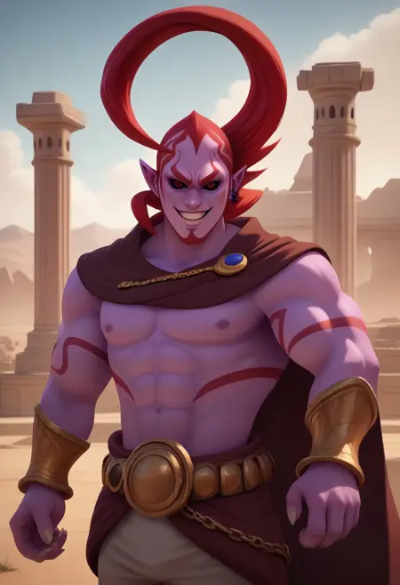 Erazor Djinn, light purple skin, cardinal red hair, black sclera, red pupils, muscular, long brown cape, gold armbands, baggy white pants
