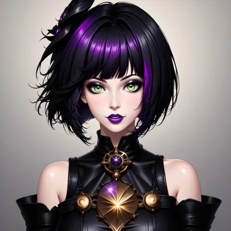 1woman,black hair,bob cut,medium hair,green eyes,purple lips,black dress,goth