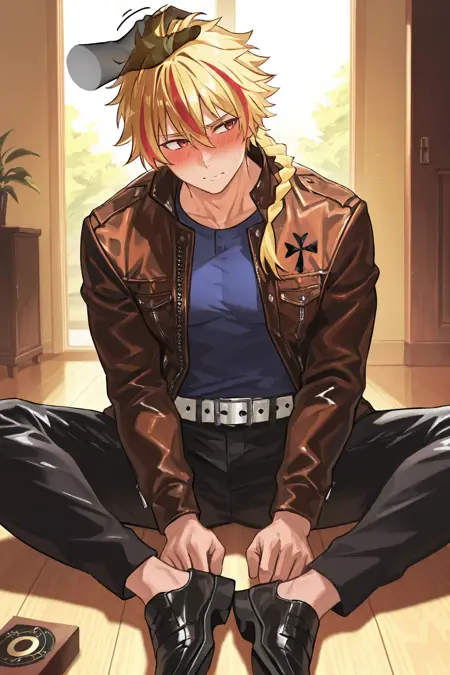 2段階目覚醒: 茶色のジャケット, レザーのジャケット, 長袖, ジッパー, 青いシャツ, 白いベルト, ベルトのバックル, 黒いズボン, 黒い靴, 黒い十字