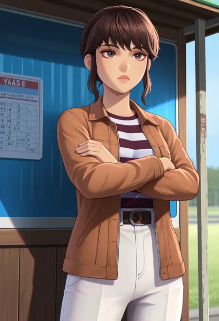 服装(混沌理论) - 棕色夹克,敞开式夹克,条纹衬衫,白色裤子,白色鞋履