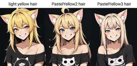 Pastel Hairs offers a selection of paler hair colours for greater hair diversity, they also tend to have less bleed than directly prompted colour. Use them with your hair prompt, like "PastelOrange2 hair" or "PastelBlue3 ponytail". Rearranging their position in the prompt can affect the tone, if too pale move them closer to the start of the prompt.