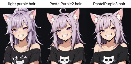 Pastel Hairs offers a selection of paler hair colours for greater hair diversity, they also tend to have less bleed than directly prompted colour. Use them with your hair prompt, like "PastelOrange2 hair" or "PastelBlue3 ponytail". Rearranging their position in the prompt can affect the tone, if too pale move them closer to the start of the prompt.