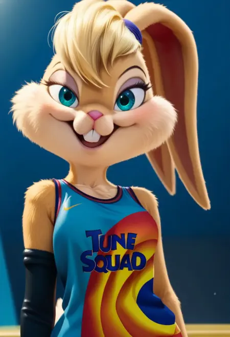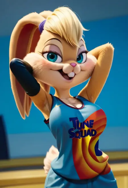 洛拉·邦尼,来自《空间大灌篮:重生》的3D设计。AI实际上能够正确生成并拼写出她球衣上的“Tune Squad”文字(请参见我测试中效果最好的一些示例图片),但这种情况比较罕见,大部分时候文字会显示为乱码。除此之外,该模型表现完美。如果你想移除她球衣上的文字,可以在负面提示中加入类似“text on shirt”的内容,这会有帮助。