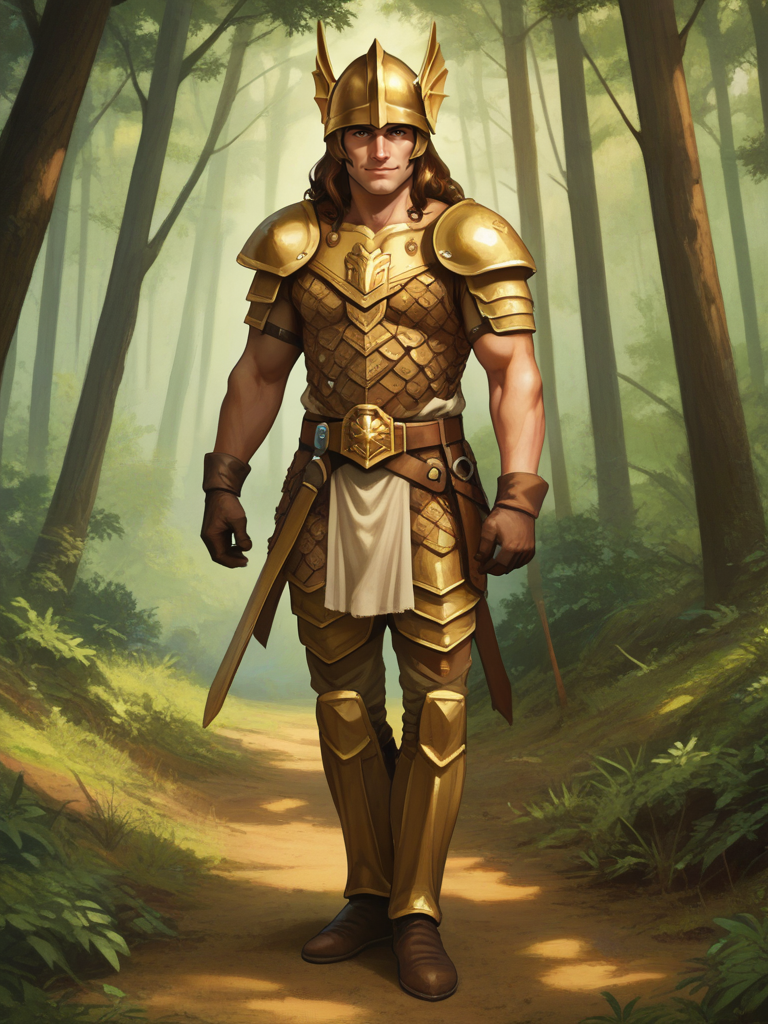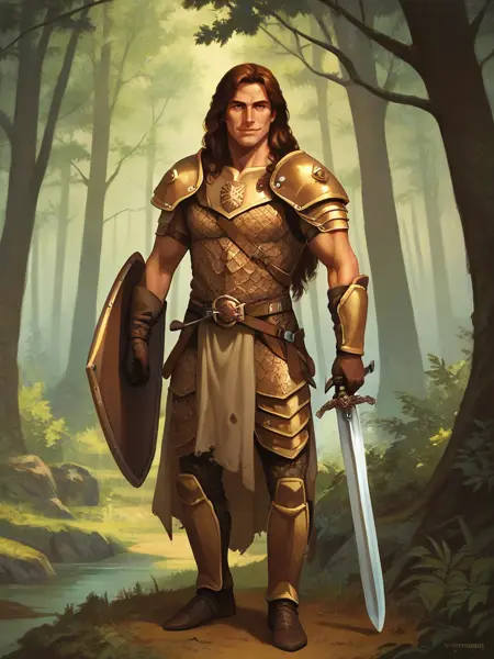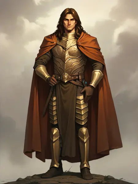 caramon, 1boy, male focus, long hair, brown hair, brown eyes, cloak, armor, dhelm