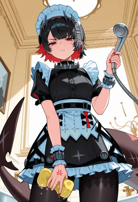 触发词 + 外貌: ell3nj0e, 眼下痣, 鲨鱼尾, 鳍, 耳钉, 短发, 彩色内发, 黑发, 红发, x 发饰, 女仆头饰, 红眼