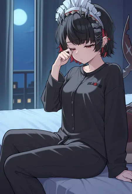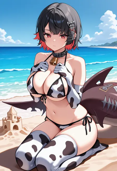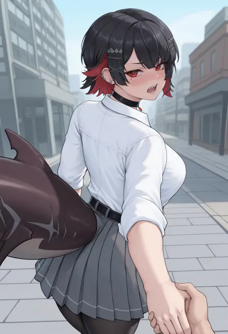 트리거 + 외모: ell3nj0e, 눈 밑 점, 상어 꼬리, 지느러미, 귀 피어싱, 단발, 색상 내발, 검은 머리, 빨간 머리, x 머리 장신구, 메이드 헤드기어, 빨간 눈
