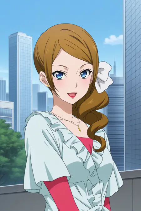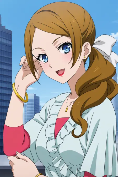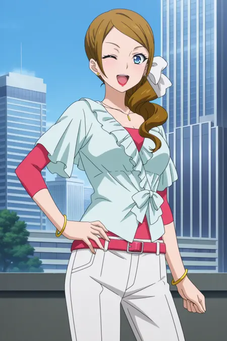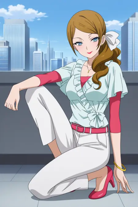 kominato eriko, 긴 머리, 갈색 머리, 중간 갈라진 앞머리, 옆머리, 옆 머리끈, 드릴 머리끈, 흰색 머리 리본, 파란 눈, 메이크업, 빨간 입술, 목걸이, 스타드 귀걸이, 녹색 블라우스, 짧은 소매, 분홍색 셔츠, 팔꿈치보다 긴 소매, 팔찌, 분홍색 벨트, 흰색 바지, 분홍색 신발, 하이힐