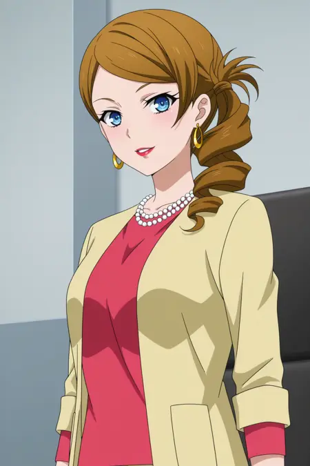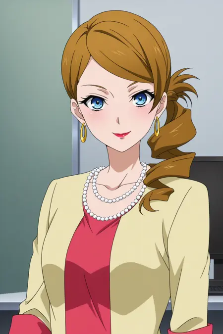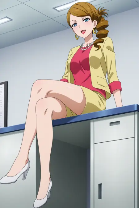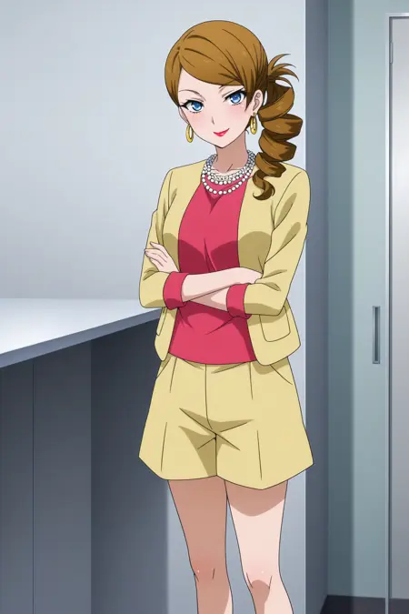 kominato eriko, 긴 머리, 갈색 머리, 중간 갈라진 앞머리, 옆 머리끈, 드릴 머리끈, 파란 눈, 메이크업, 빨간 입술, 진주 목걸이, 링 귀걸이, 노란 재킷, 팔꿈치보다 긴 소매, 분홍색 셔츠, 노란 반바지, 흰색 신발, 하이힐