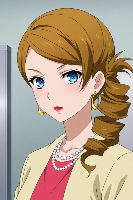 kominato eriko, 长发, 棕发, 分开的刘海, 侧马尾, 钻石马尾, 蓝眼睛, 妆容, 红唇, 珍珠项链, 圆环耳环, 黄色夹克, 袖子超过肘部, 粉色衬衫, 黄色短裤, 白色鞋履, 高跟鞋