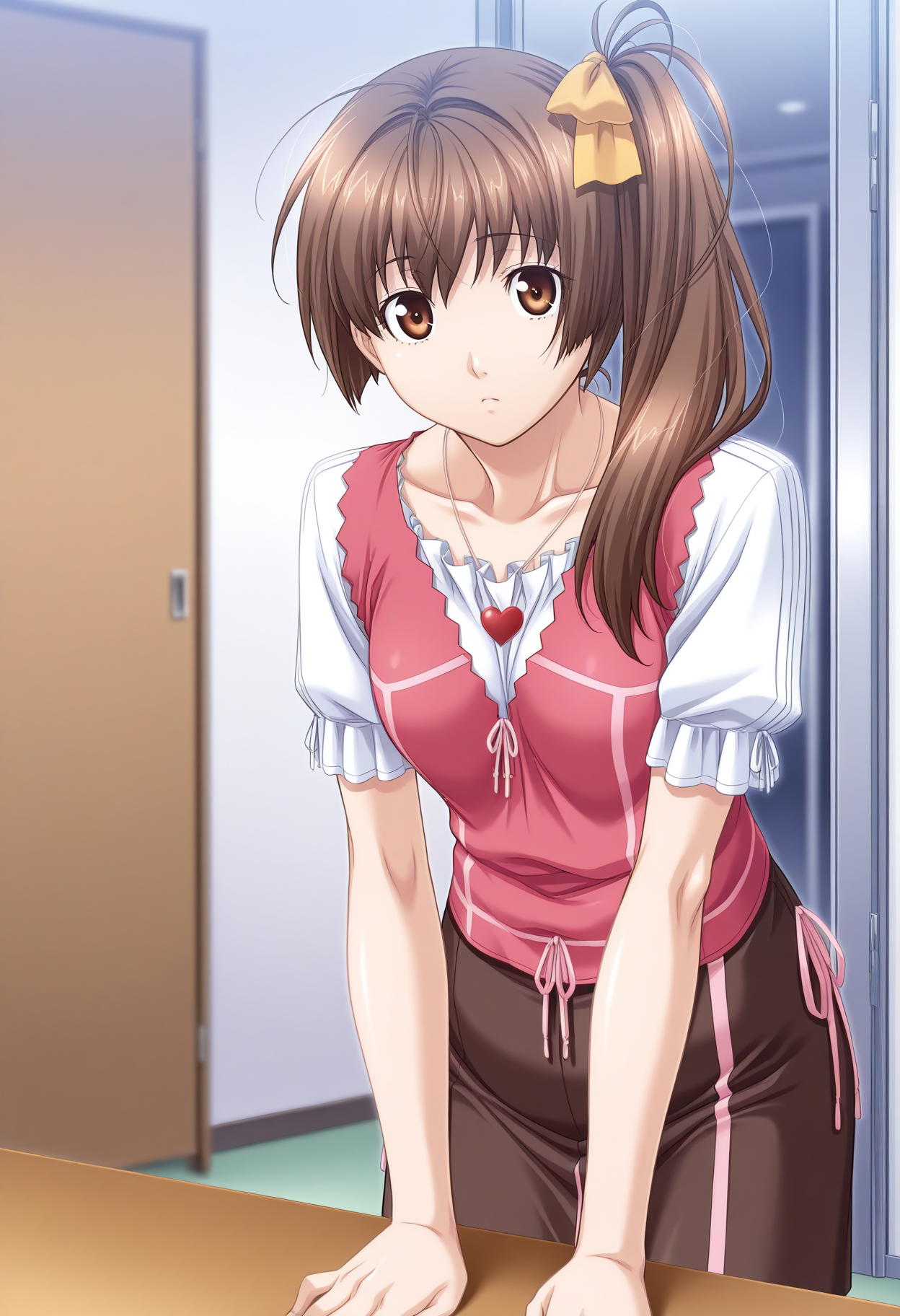 score_9, score_8_up, score_7_up, score_6_up, score_5_up, score_4_up, masterpiece, source_anime, 1girl, c-sawa, long hair, brown hair, brown eyes, side ponytail, hair bow, white shirt, short sleeves, pink vest, brown skirt, heart necklace, pink ribbon, looking at viewer, indoors, depth of field, cowboy shot, light smile, head tilt,