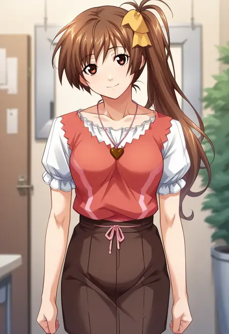score_9, score_8_up, score_7_up, score_6_up, score_5_up, score_4_up, masterpiece, source_anime, 1girl, c-sawa, long hair, brown hair, brown eyes, side ponytail, hair bow, white shirt, short sleeves, pink vest, brown skirt, heart necklace, pink ribbon, looking at viewer, indoors, depth of field, cowboy shot, light smile, head tilt,