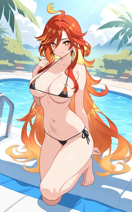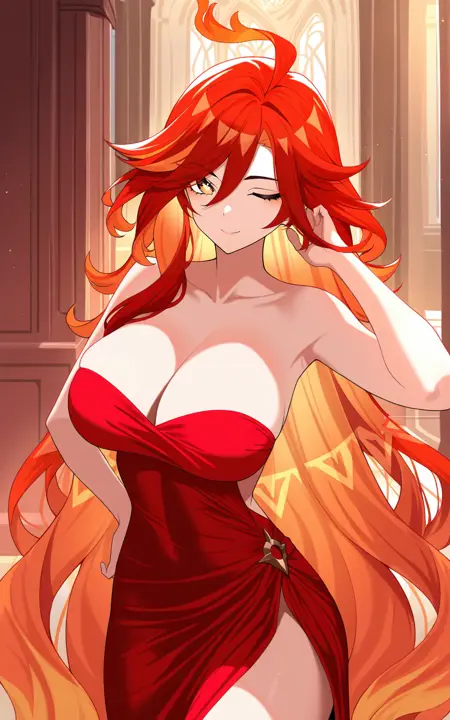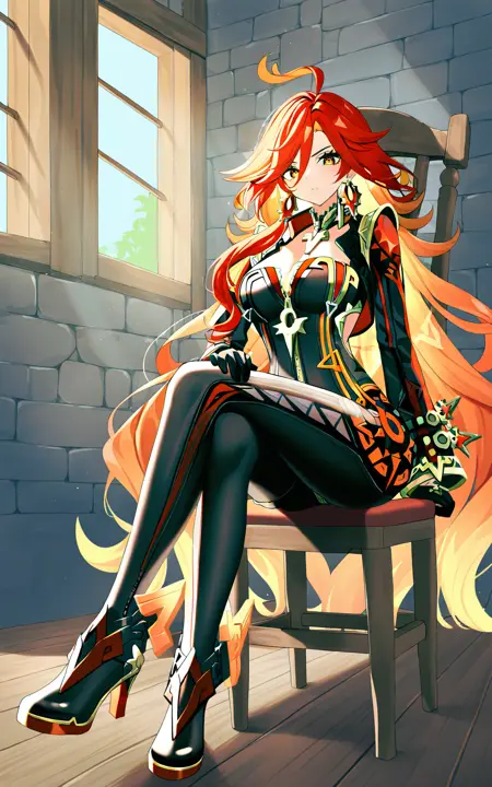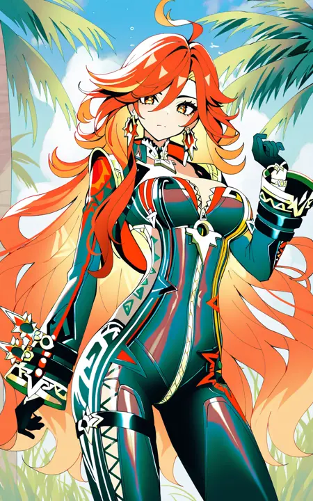 | 训练词汇 | mavuikagenshin, xomaheu-shaped pupils, long hair, bangs, red hair, orange hair, multicolored hair, large breasts, eyes, hair between eyes, very long hair, ahoge, gradient hair已复制! pyrarchn outfit, natanatax bodysuit, gloves, long sleeves, cleavage, jewelry, earrings, choker, bodysuit, zipper, high heels已复制! |