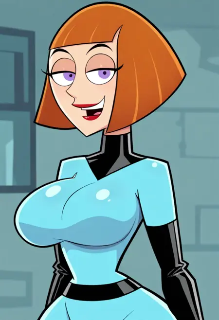 デフォルトの外見: Maddie Fenton、クルビー、ショートヘア、ボブカット、ストレート前髪、丸い目、パープルの目、まぶた、リップスティック、巨乳、ブラックのタートルネック、青いボディスーツ、ブラックのベルト