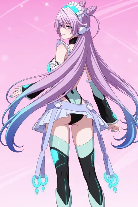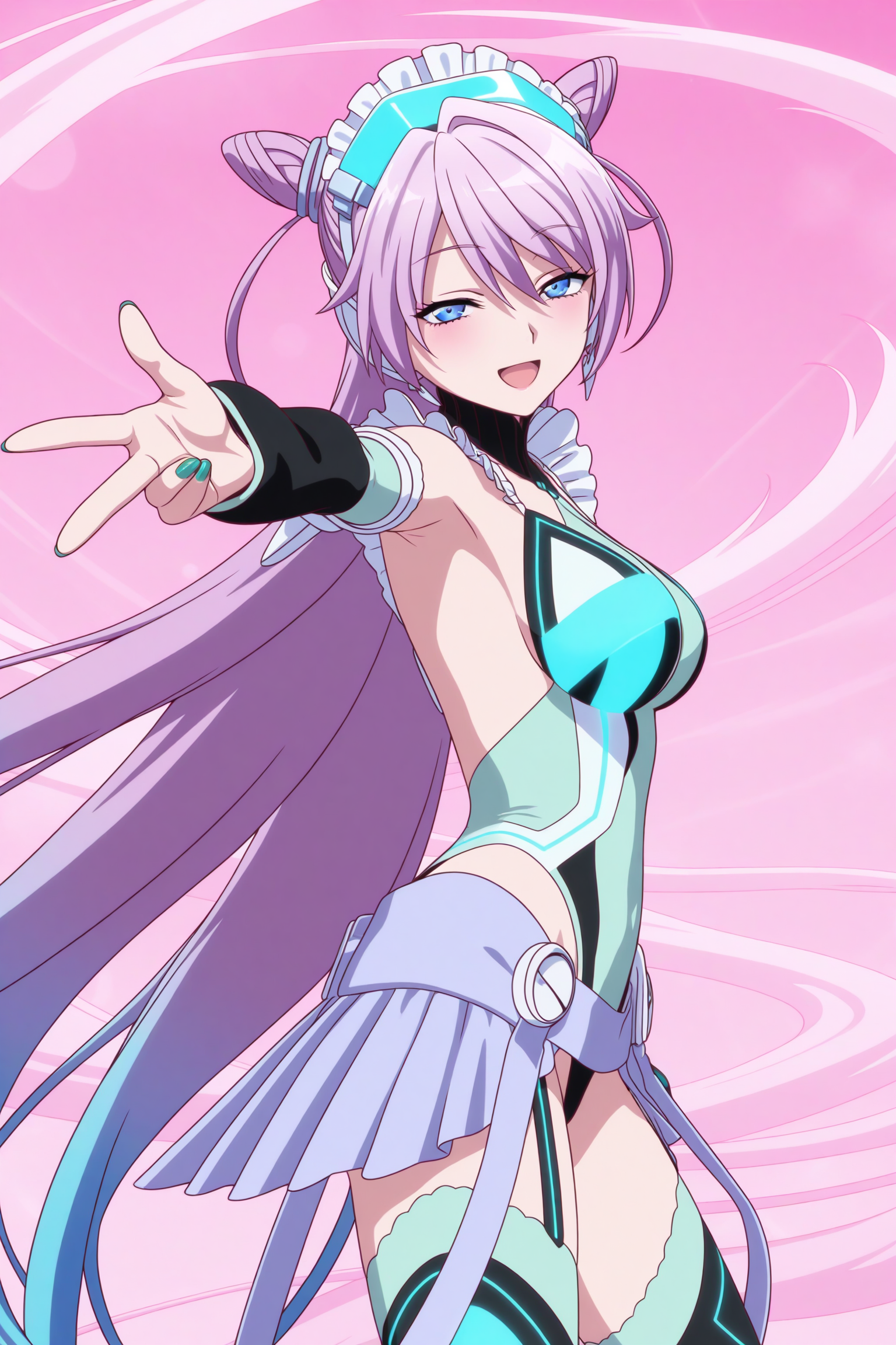 arliko, very long hair, gradient hair, purple hair, double bun, cone hair bun, headdress, blue eyes, leotard, detached sleeves, nail polish, green nails, skirt, thighhighs, toenail polish, toeless legwear, high heel boots