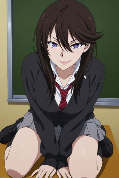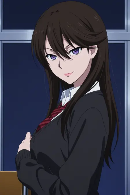 はらぐちゆりあ、長い髪、茶色の髪、額を覆う前髪、目の間に髪、紫の目、黒いカーディガン、白いシャツ、カッターシャツ、赤いネクタイ、縞模様のネクタイ、グレーのスカート、プリーツスカート、黒い靴下、膝上靴下、黒い靴、ローファー