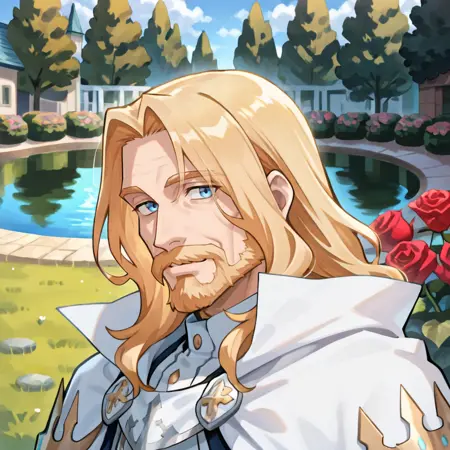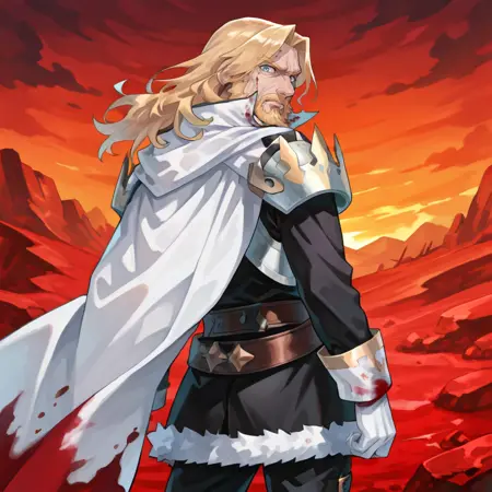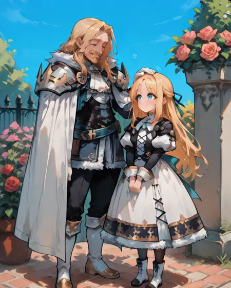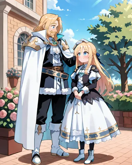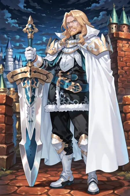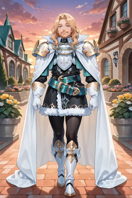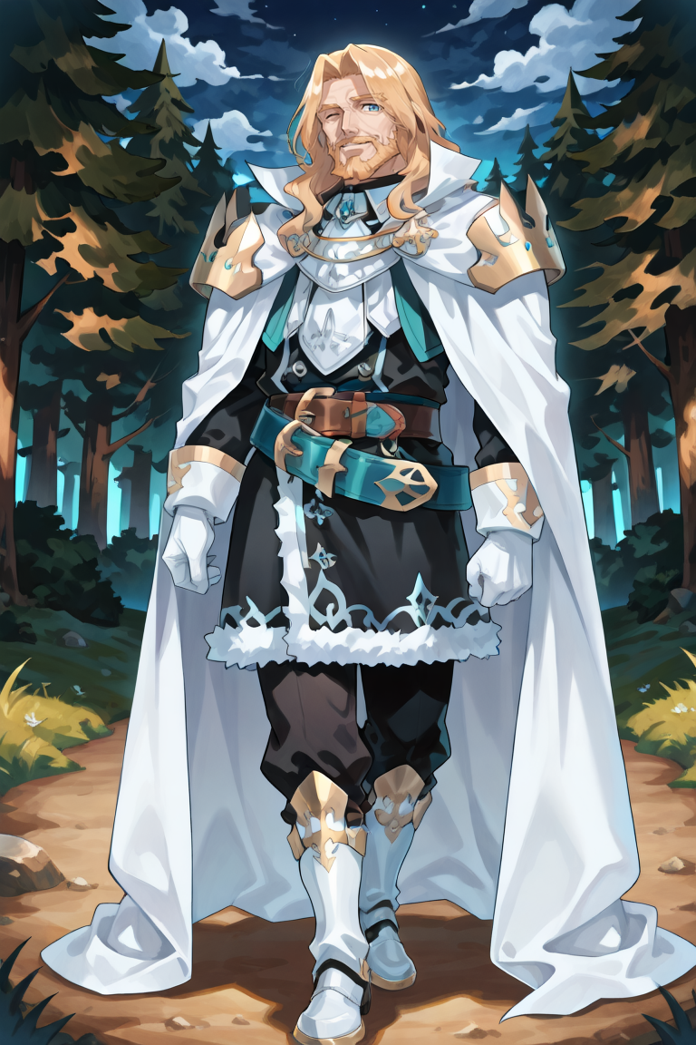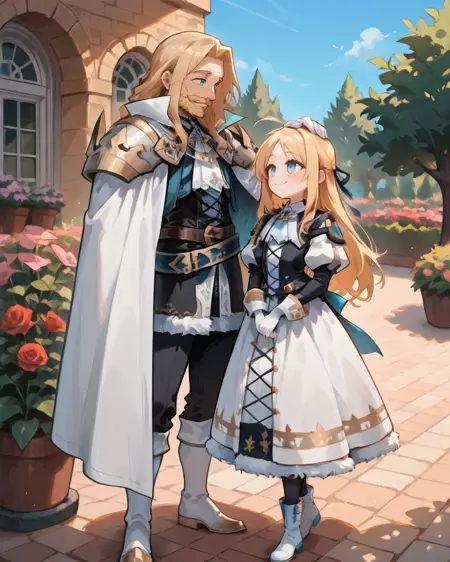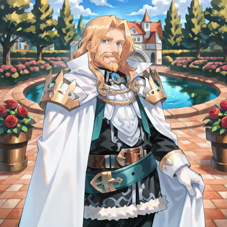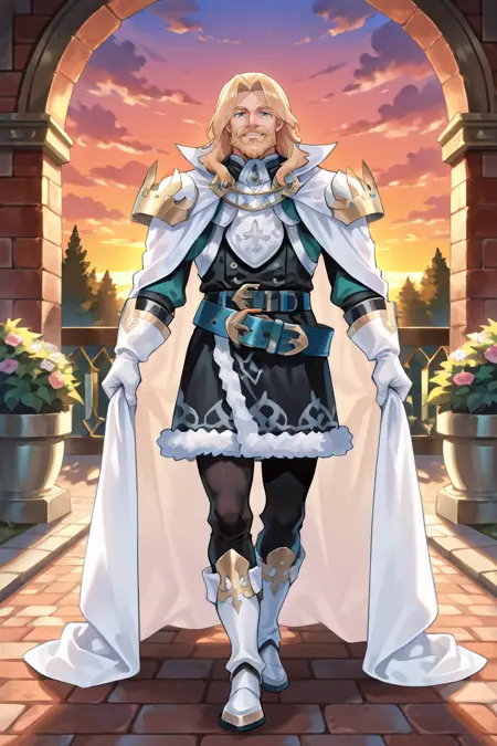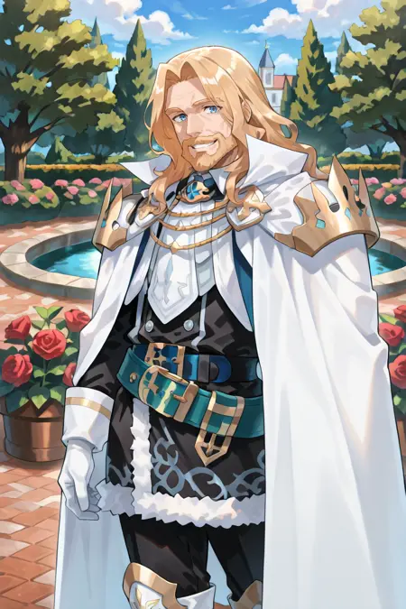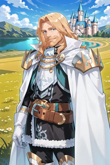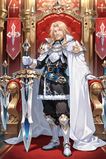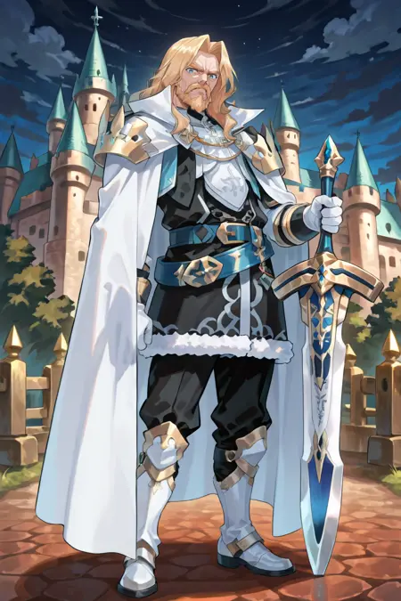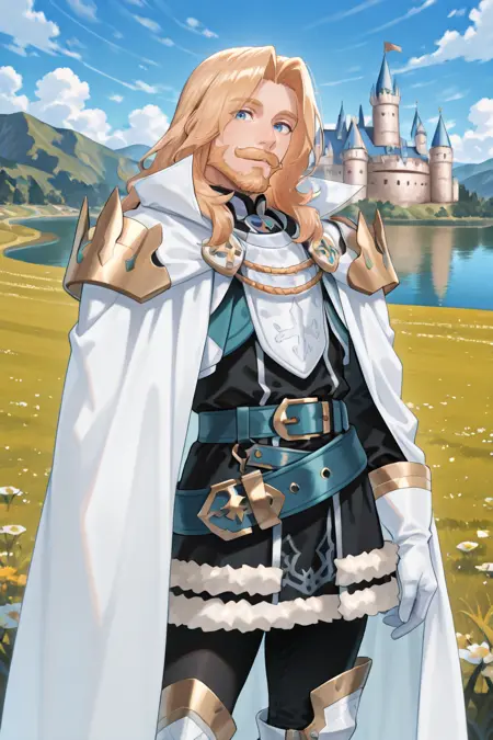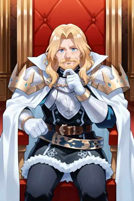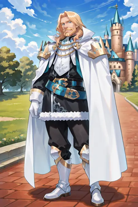 有用标签: 1个男孩,皱纹,老男人,蓝眼睛,金发,长发,面部毛发,胡子,胡须,白色斗篷,有领斗篷,盔甲,护肩,黑色裤子,白色手套,毛皮镶边裙,黑色裙子,腰带,白色靴子