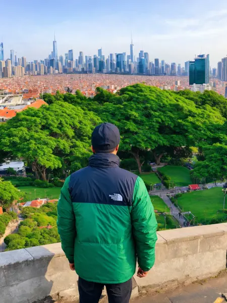 유용한 키워드: 긴 소매, 뒷모습, 팔을 옆에 두기, 재킷, 손을 주머니에 넣기