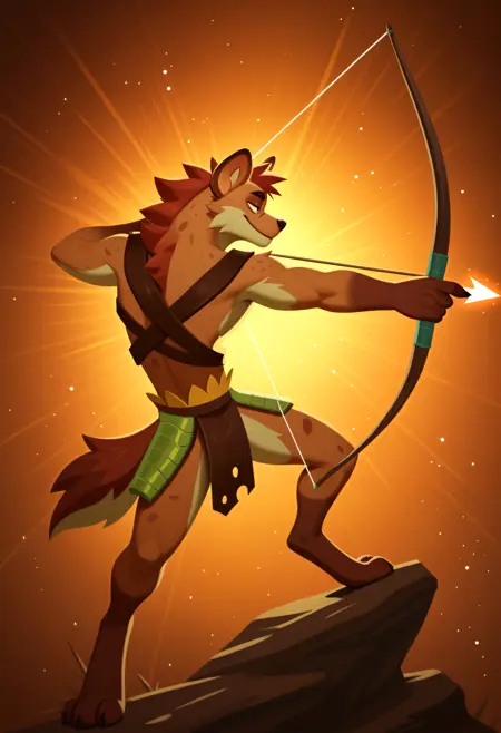 red hair, odie, fluffy tail, brown fur, armor, fingerless gloves,gloves, hyena boy, tail, scar on nose, bow (weapon), quiver,