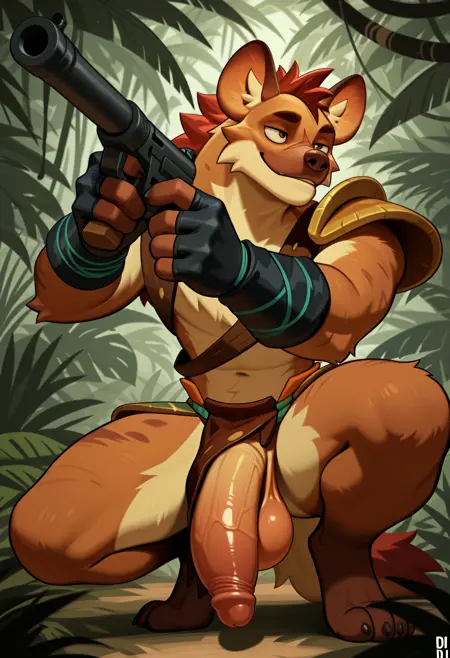red hair, odie, fluffy tail, brown fur, armor, fingerless gloves,gloves, hyena boy, tail, scar on nose,