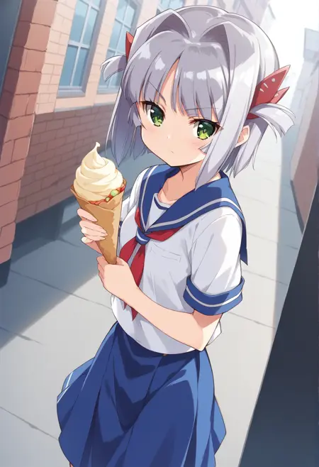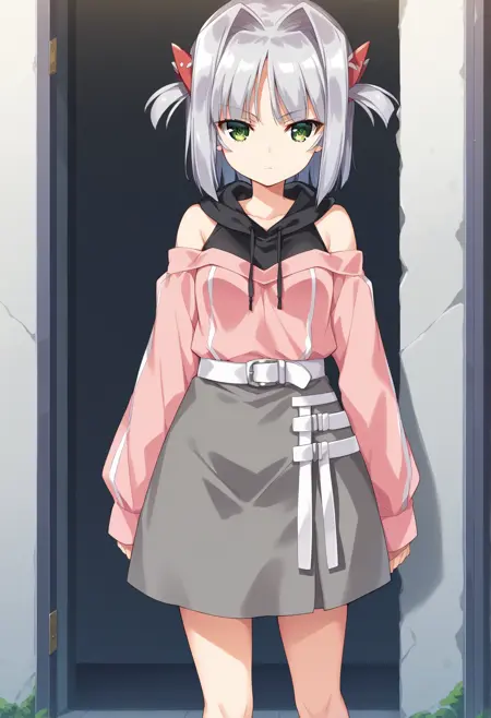 触发词: lora:kousaka\_rui\_v1.0-000008:0.8,小坂瑞月,绿眼睛,灰发,短发,两侧上扎,发饰,