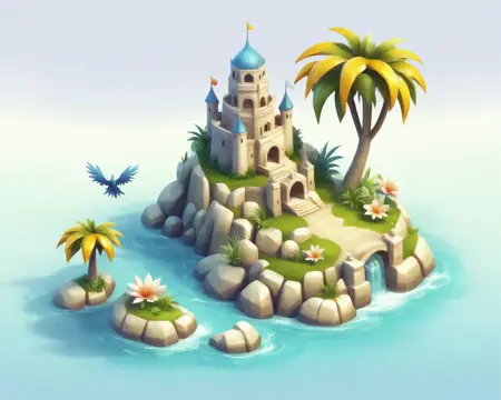 低ポリゴンの風景、ピクセル化、3D、等角スタイルで、島やオブジェクトなどのゲームアセットを生成します。