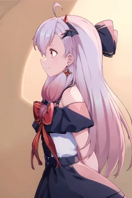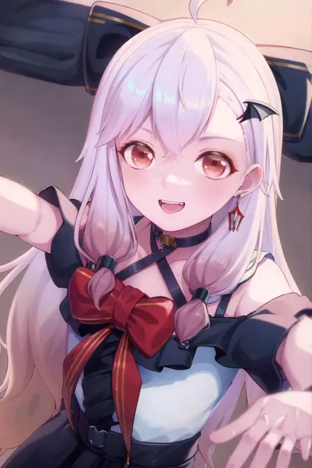 jiaran, vampire dress, black hair bow, pink hair, gradient hair, red eyes