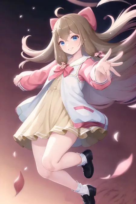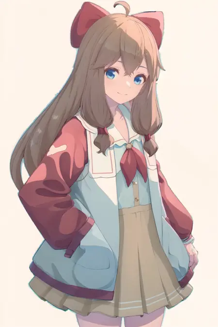 jiaran, official dress, blue eyes, brown hair, pink hair bow, jacket, neckerchief