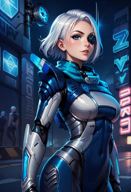 -"bangs, blue eyes" for no headgear, add "eyepatch" if wanted