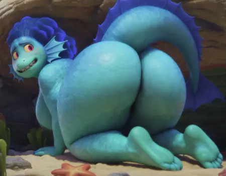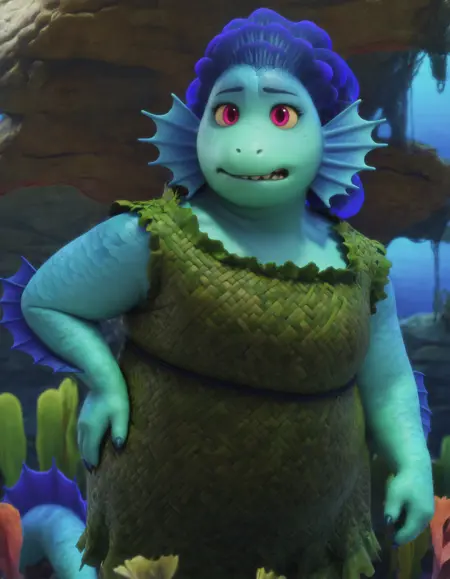 plump,overweight,female,sea monster,green dress made with seaweed,blue hair as fins,blue and greenish scales