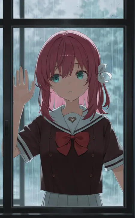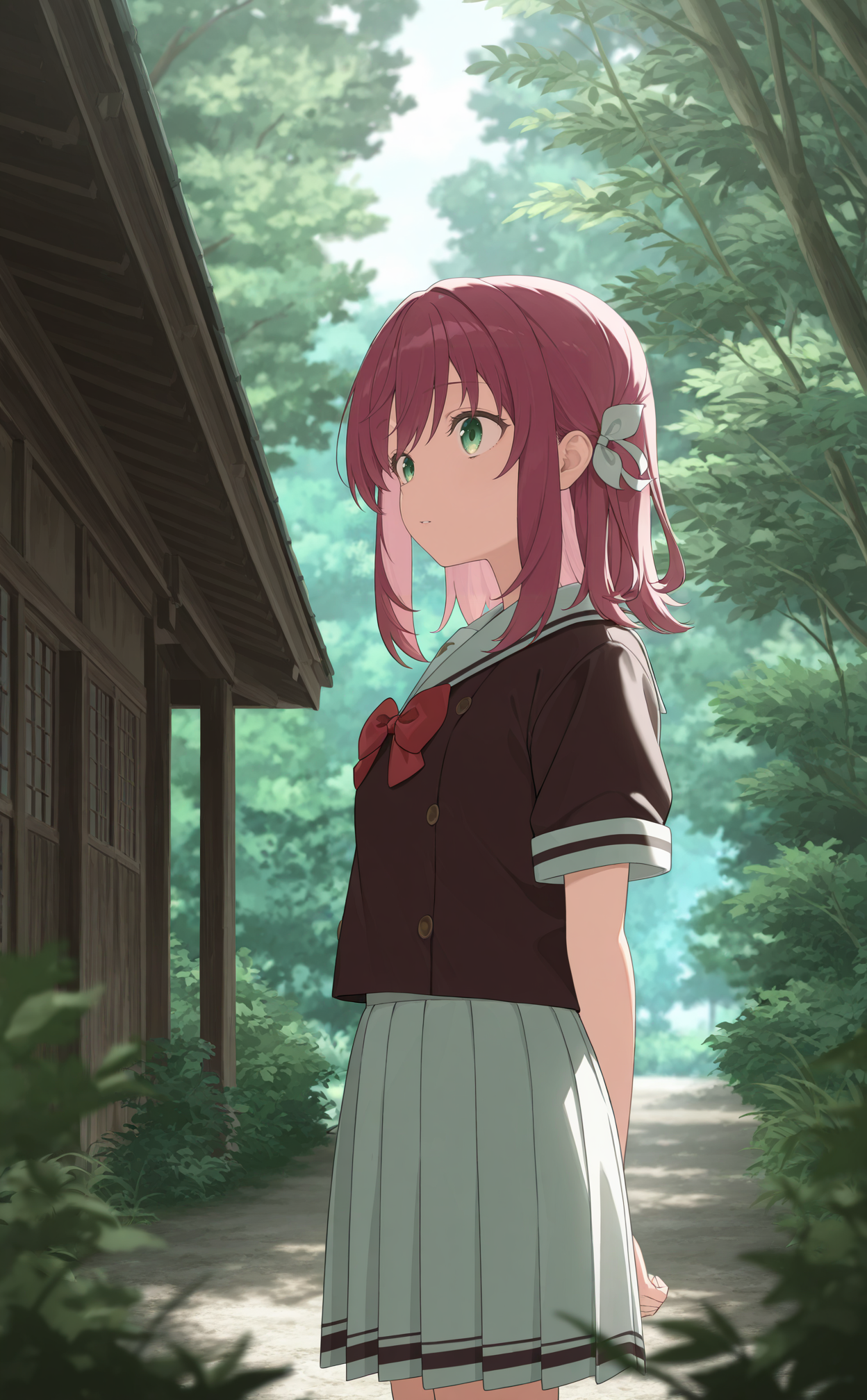 Costume:brown serafuku, white sailor collar, short sleeves, red bowtie, white skirt, black kneehighs, loafers,