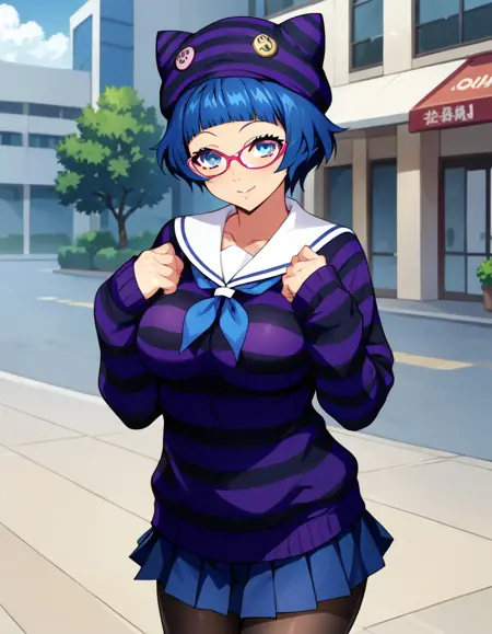 honokasweater, 縞模様のセーター, プリーツスカート, 黒タイツ, ローファー, セーラーカラー, ネッカチーフ, 動物の帽子, ボタンバッジ,