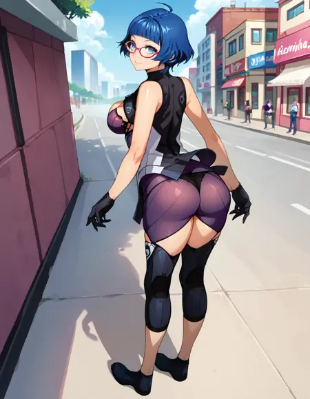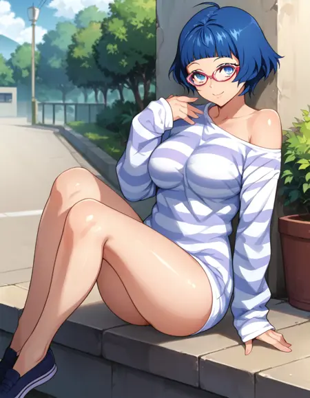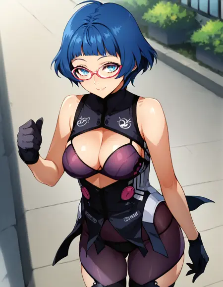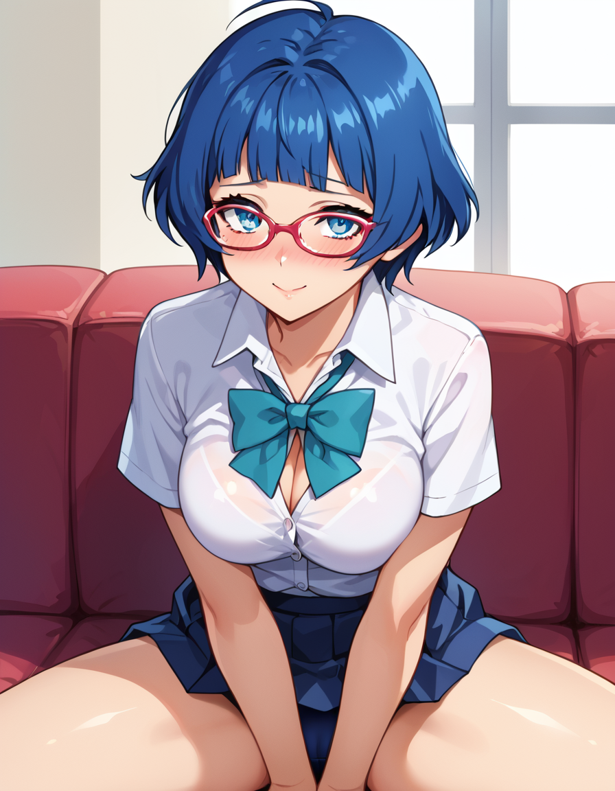inui honoka, 青い目, 青い髪, 短い髪, まっすぐな前髪, 眼鏡, 赤枠の眼鏡, 大きな胸(「ahoge」を削除)