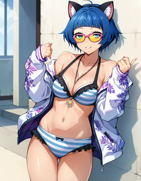 honokaswim, 縞模様のビキニ, フリル付きビキニ, ジュエリー, ネックレス, 偽の動物の耳, 猫の耳, サンダル, 夏用ジャケット, 開いたジャケット, 長袖, 锁骨, 肩出し, へそ,