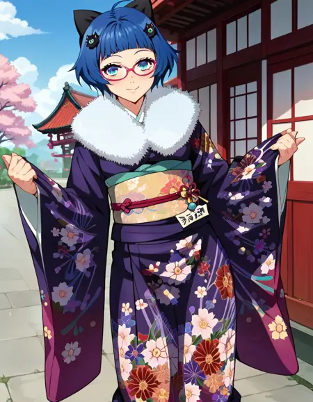 - honokakimono, 毛皮縁の着物, 紫の着物, 振袖, 花柄, 毛皮縁, 帯, バンダナ, 足袋, 靴下, 猫の髪飾り, 髪飾り, 絵馬,