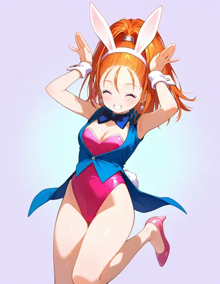 可选提示词:兔耳朵,粉色紧身衣,腕带,蝴蝶结,蓝色无袖燕尾服,粉色高跟鞋,