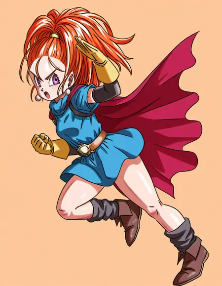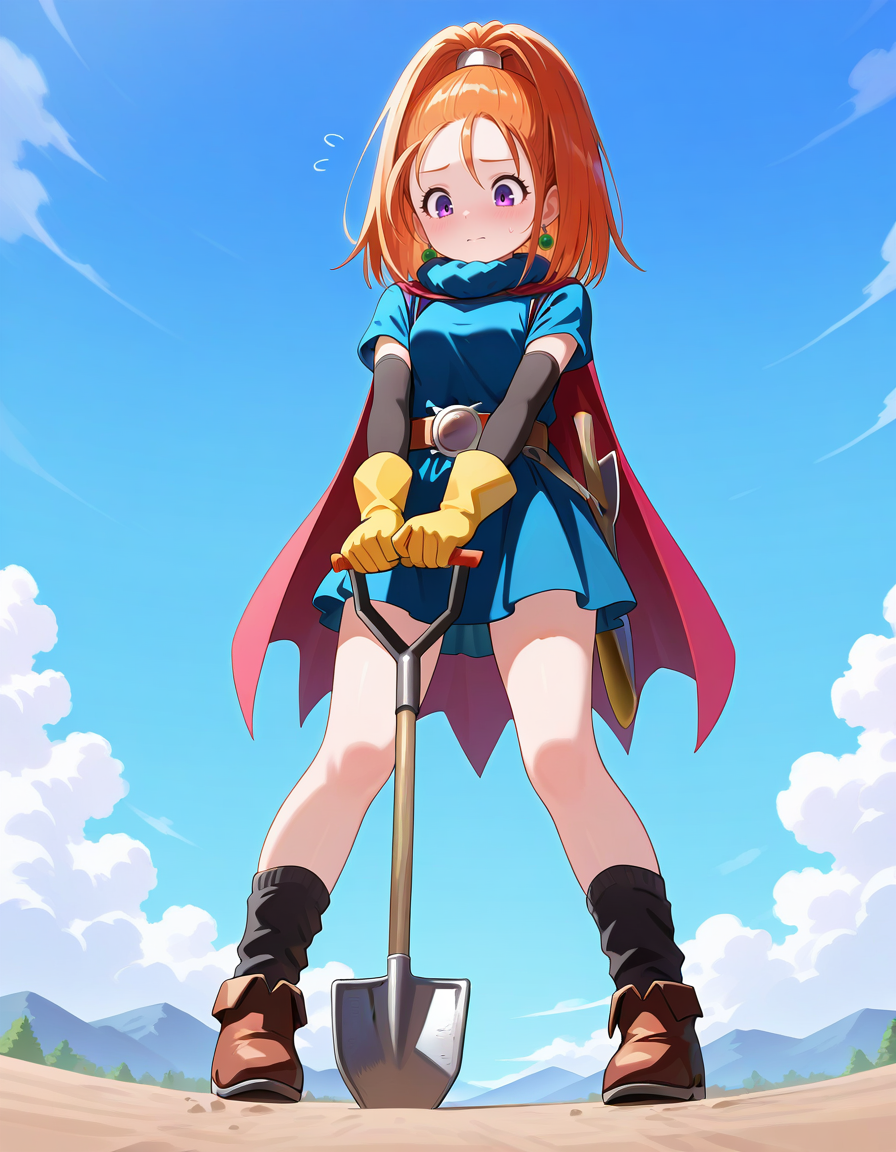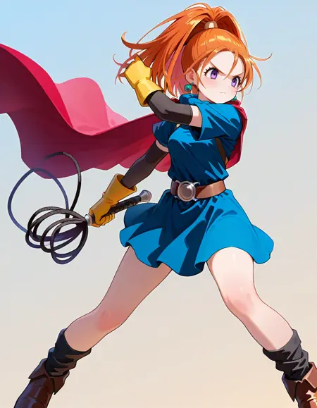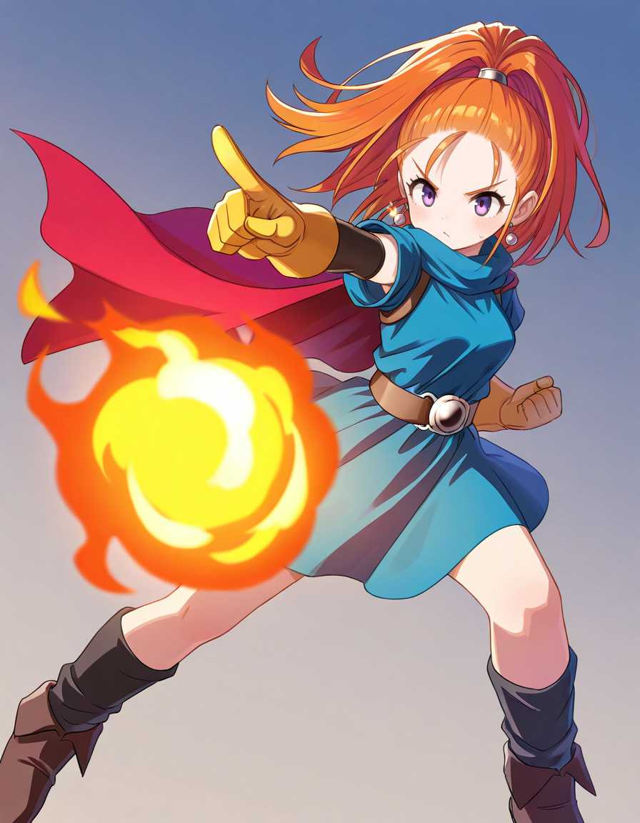 推荐提示词:1girl,紫色眼睛,耳环,橙色头发,高马尾,黄色手套,蓝色连衣裙,腰带,红色斗篷,短袖,黑色袜子,棕色鞋履,