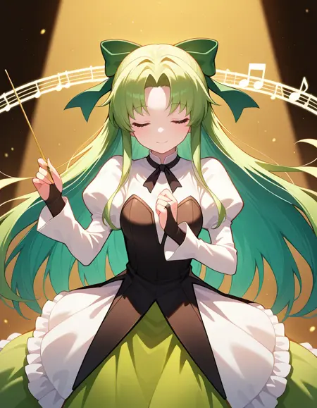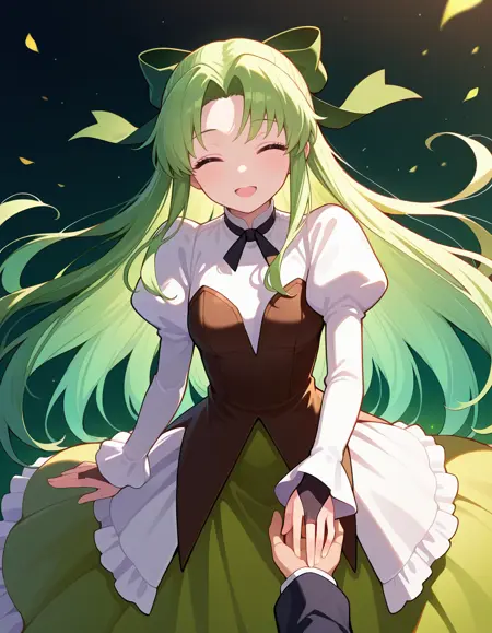 권장 프롬프트: 소녀, 녹색 긴 머리카락, 녹색 눈, 리본, 드레스, 줄리엣 소매, 긴 소매, 웨딩 장갑, 머리 리본, 부츠,