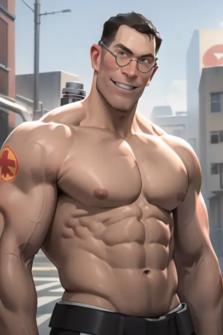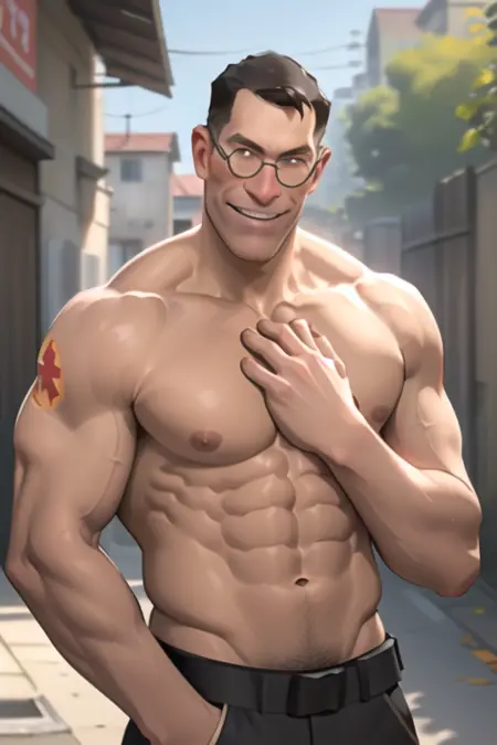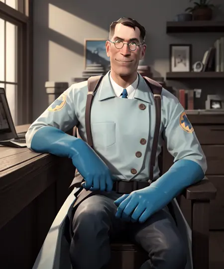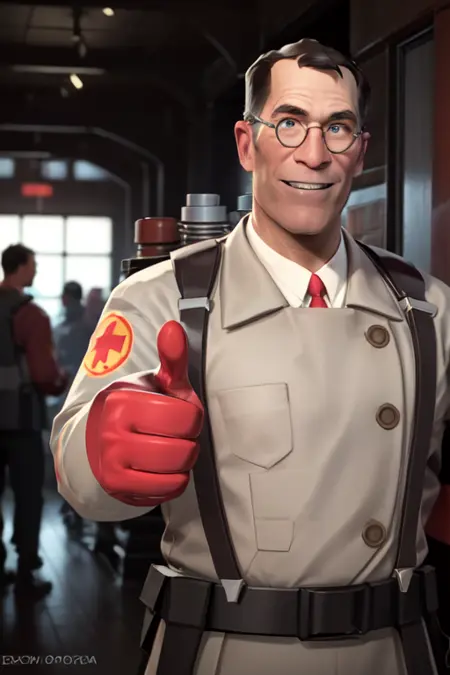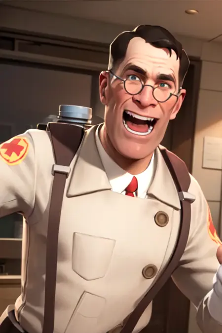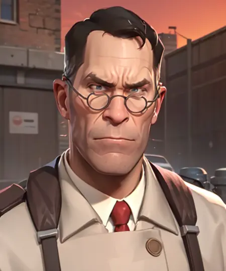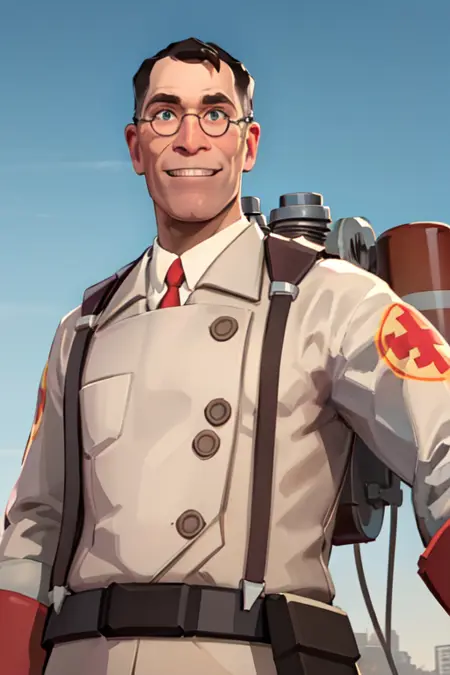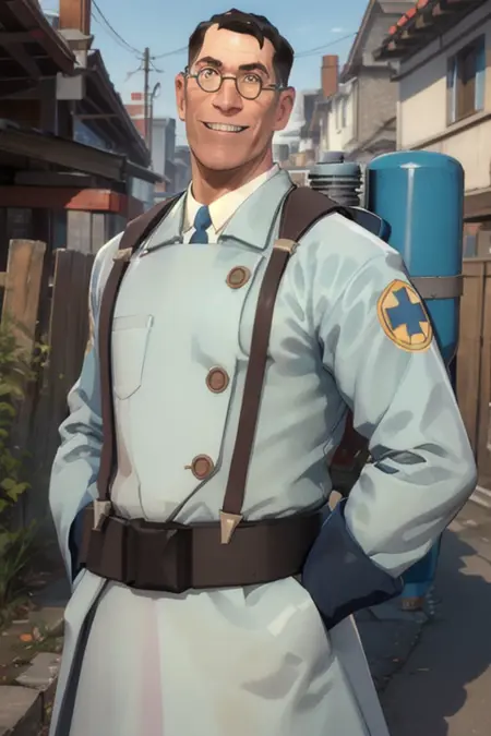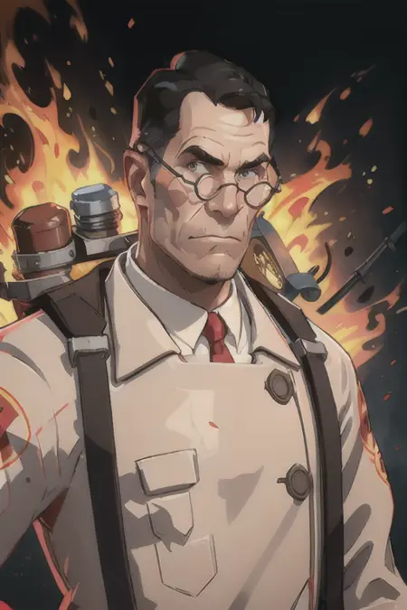 红色/蓝色领带、圆框眼镜、面部胡须、实验服、外套提示