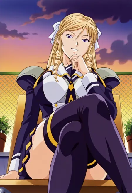 Leona Morimoto,1girl,long hair,blonde hair,drill hair,blue eyes,hair ornament