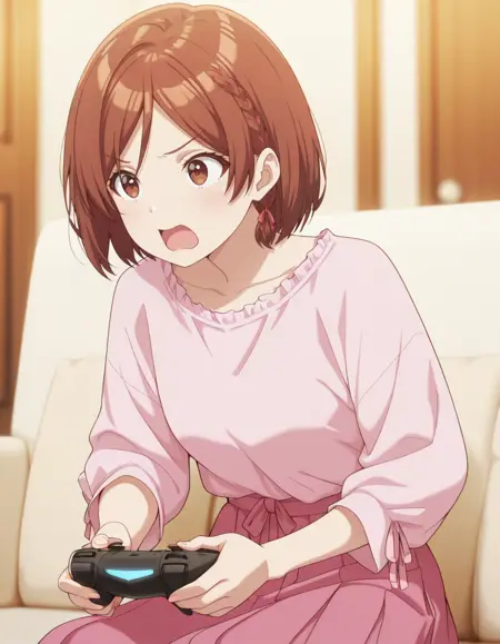 <lora:akane_sakuramori-kurakon_s1-ixl-anime-soralz:1>, akane sakuramori (kurakon), 短い髪, 茶色の髪, 横編み, 髪リボン, 分け目のある前髪, 茶色の目