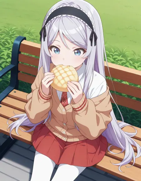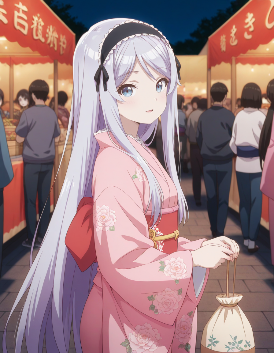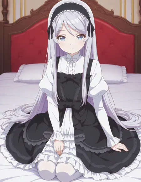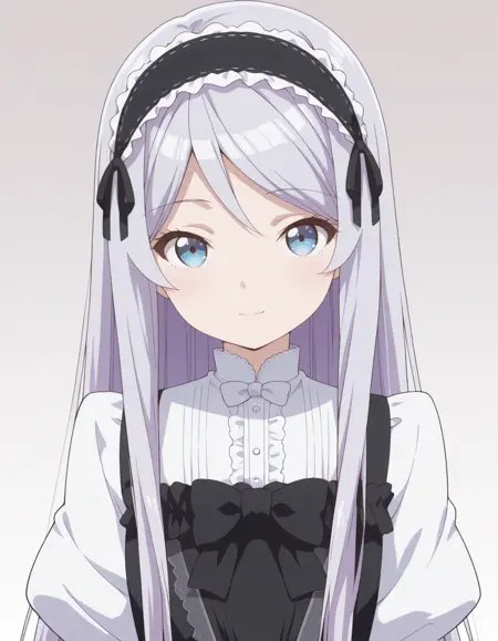 <lora:shisei_houjou-kurakon_s1-v3-ixl-anime-soralz:1>, shisei houjou (kurakon), 极长发,灰色头发,荷叶边发带,发带,鬓发,蓝色眼睛