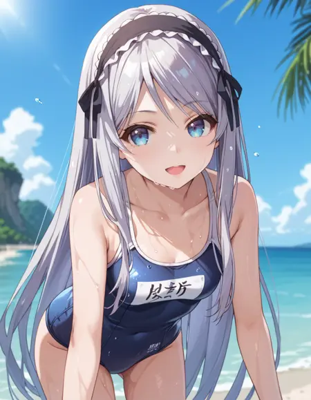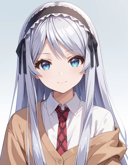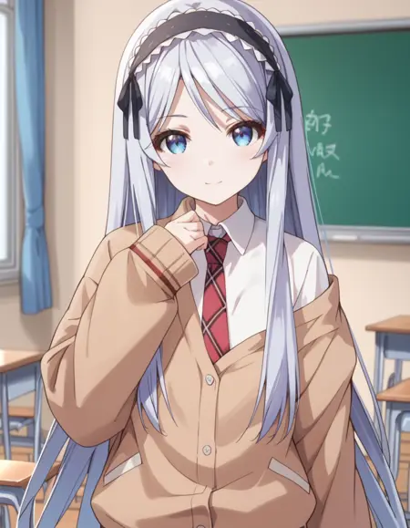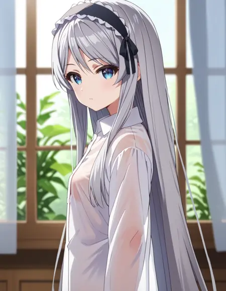 <lora:shisei_houjou-kurakon_s1-v3-ixl-anime-soralz:1>, shisei houjou (kurakon), 极长发,灰色头发,荷叶边发带,发带,鬓发,蓝色眼睛